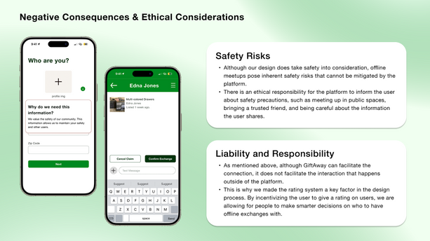 My interview questions were largely based around discovering more about users feelings with second hand goods, interactions with strangers. Along with this, I thought it was important to understand users' behavior in daily life regarding items they no longer use or need. These questions were based aroudn the spaces we found during our competitive analysis.