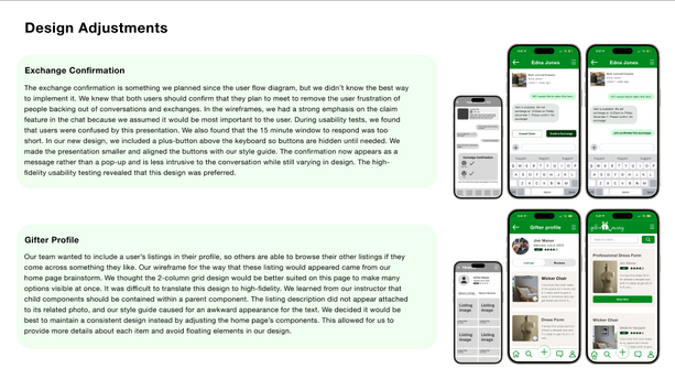 After creating this design system, we divided task flows amongst our group members. We found that in our design process we had many different ideas on how we wanted the exact layout to look on some of the pages. In these scenarios, multiple iterations and decided which one was better fit for the users, aesthetically and functionally. This iterative process can be seen in the design of the gifter profile page. This ensured that each of our designs were purposeful and strategic and catered towards the user. In addition to the designing we repeated our usability testing, discovering minor design consistency issues, adjusting them accordingly in the final prototype.
